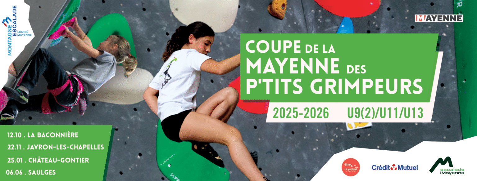 La Coupe de la Mayenne des P’tits Grimpeurs est un circuit de compétitions pour les licencié·e·s mayennais·e·s des catégories U9 (2è année), U11 et U13.